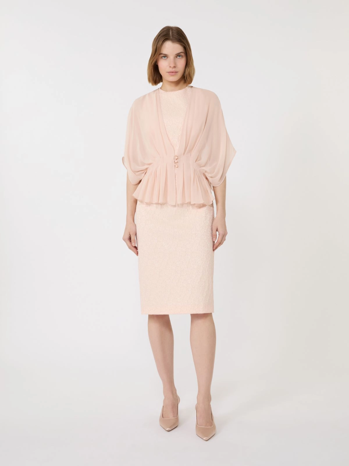 Draped-silhouette cape with pleating at the waist that adds movement and volume.